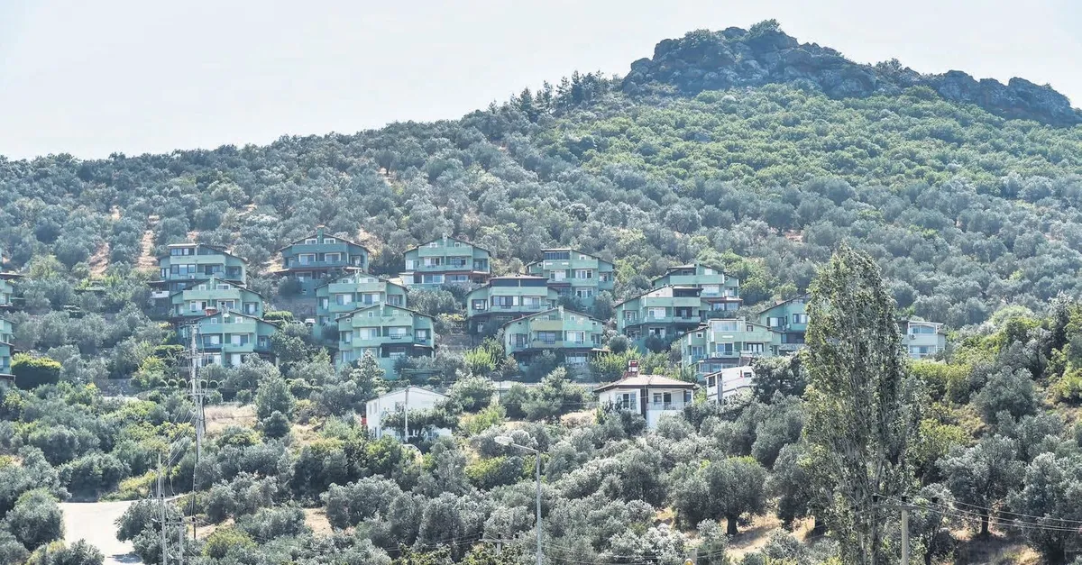 Burhaniye’ye bağlı Pelitköy’de 14 yıl önce yüzlerce zeytin ağacı kesilerek müstakil villaların olduğu bir site yapıldı. Ardından tepkiler üzerine yapılan doğa katliamını gizlemek için villaları yeşile boyadılar
