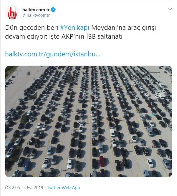Aynı zamanda CHP'nin haber kanalı Halk TV de, aynı skandala imza atarak Yenikapı'daki araçlar diye söz konusu fotoğrafı kullandı.