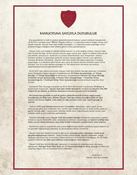 Haberde belirtildiği üzere, Okçular Vakfı Spor Kulübü Derneği hakkında bu yalan haberi yapanlar iddialarını ispatla mükelleftir. İddia sahiplerini bu iddialarını ispatlamaya ve haberde verildiği iddia edilen paranın banka dekontunu veya banka havale makbuzunu yayınlamalarını talep ediyoruz.