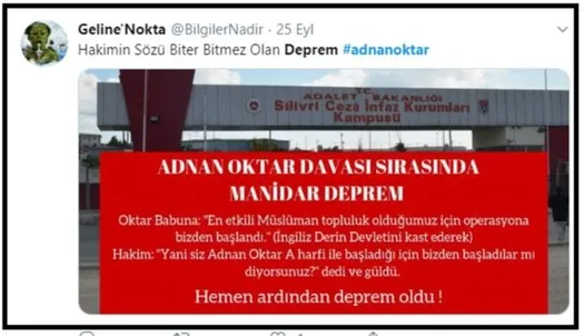 Yaklaşık 15 aydır cezaevinde bulunan ve bugün 9. duruşması yapılan Adnan Oktar Örgütü davasının görüldüğü Silivri de önceki günkü depremde sert şekilde sallandı. Son depremin ardından Adnan Oktar örgütünün sosyal medyadaki trolleri harekete geçti ve depremin kendilerine yönelik operasyonun ardından gerçekleştiğini iddia etti.