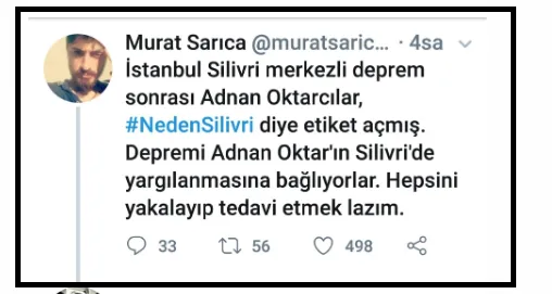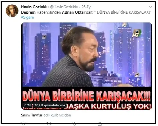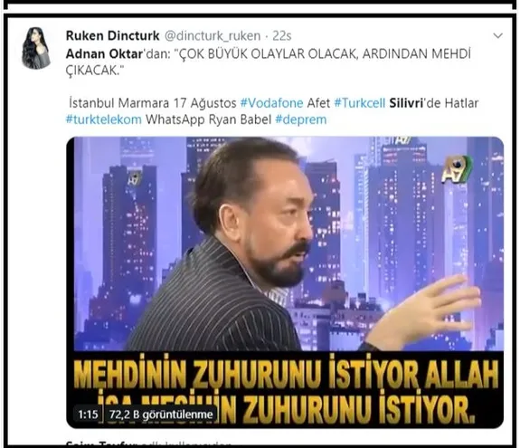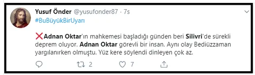 Kendisini kainat imamı ilan eden FETÖ ve Mehdiliğini ilan eden Adnan Oktar örgütü hezeyanlarına bir yenisini ekledi. İki örgüt de 26 Eylül tarihinde İstanbul’da gerçekleşen 5.8 şiddetindeki depremin kendilerine yapılan operasyon nedeniyle meydana geldiğini iddia etti. FETÖ’cü Önder Aytaç ve Kazım Güleçyüz’ün tweetlerine Adnan Oktar Örgütü de sosyal medyadan destek verdi. Bu hezeyan sosyal medyada alay konusu oldu.