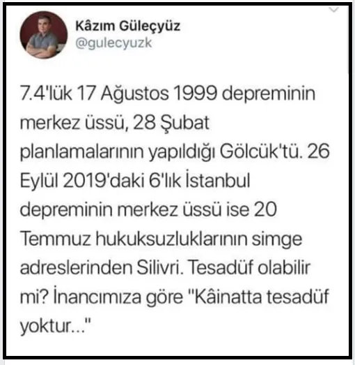"Bu depremin herkes rakamını gücünü tartışıyor. Depremin merkez üssü ise tam Silivri önü. Acaba bunun hiçbir anlamı yok mu? Biliyorsunuz değil mi? 'Orası şu anda en büyük Medrese-i Yusufiye ' denilebilir mi? Ben 1 şey demiyorum. Sadece soruyorum."