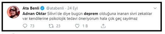 "FETÖ'cüler beni hiç şaşırtmaz, Önder Aytaç isimli firari FETÖ'cü depremi kendilerine yapılanlara bağlamış!!! Bu bir zamanlar da gece Silivri'de duvarların indiğini peygamberle toplu namaz kılındığını yazıyordu."