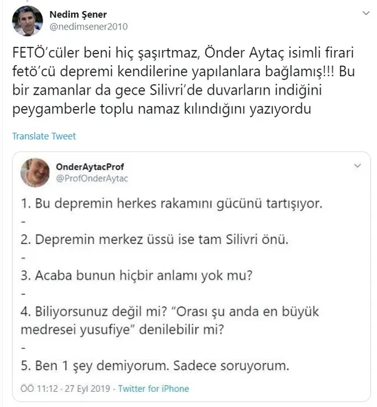 İstanbul'da önceki gün meydana gelen 4.7 şiddetindeki depremin ardından bu kez 5.8 büyüklüğünde deprem yaşandı. Gazeteci Nedim Şener, firari FETÖ'cü Önder Aytaç'ın depremle ilgili mesajlarına dikkat çekti.