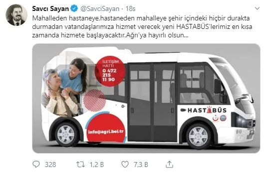 Yaptığı girişimler sonucu, hastane ve mahalleler arası olan ulaşımda hastaların çektiği sıkıntıları bitirmek adına, hastaların kendi mahallesinden bindikleri Hastabüs'lerle, şehir içinde hiçbir durakta durmadan direk hastaneye giden 10 adet Hastabüs, en yakın zamanda 10 mahallenin hizmetine giriyor. Ağrı'ya hayırlı olsun ,teşekkürler Başkan Sayan, yaparsa Savcı Sayan yapar…