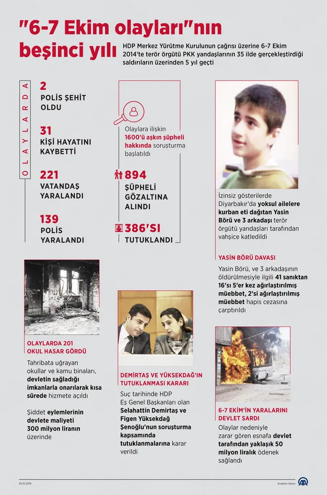 AA muhabirinin derlediği bilgilere göre, Selahattin Demirtaş yönetimindeki HDP Merkez Yürütme Kurulu tarafından 6 Ekim 2014'te yapılan açıklamanın ardından terör örgütü YPG/PKK yandaşlarının Aynularab (Kobani) bahanesiyle 35 ilde gerçekleştirdiği şiddet olaylarında 2 polis şehit oldu, Diyarbakır'da Kurban Bayramı dolayısıyla yoksullara kurban eti dağıtan Yasin Börü ve üç arkadaşının da aralarında bulunduğu 31 kişi hayatını kaybetti, 221 vatandaş ile 139 polis yaralandı.