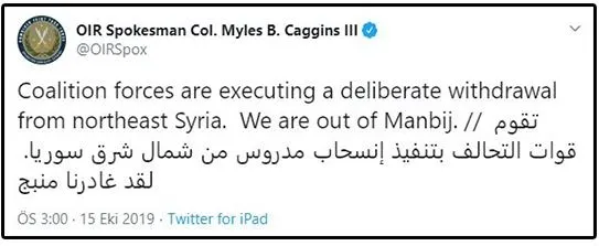 Son dakika haberi: ABD öncülüğündeki DEAŞ karşıtı koalisyon sözcüsü Myles B. Caggins, koalisyon güçlerinin Münbiç'ten çekildiğini açıkladı. Sözcü Caggins gelişmeyi Twitter hesabı üzerinden paylaştığı notla duyurdu. İşte son dakika gelişmesiyle ilgili diğre bilgiler...