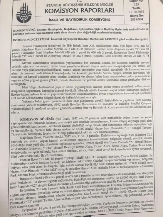 Ak Partili İBB Meclis Üyeleri, Esenler, Başakşehir, Tuzla, Kağıthane, Eyüpsultan, Şişli ve Beşiktaş'ta mülkiyeti İBB'ye ait olan ve imar planlarında değişik fonksiyonlardaki toplam 295 bin metrekare alanın park alanına çevrilmesi için Büyükşehir Belediye Meclisi'ne teklifte bulundu.