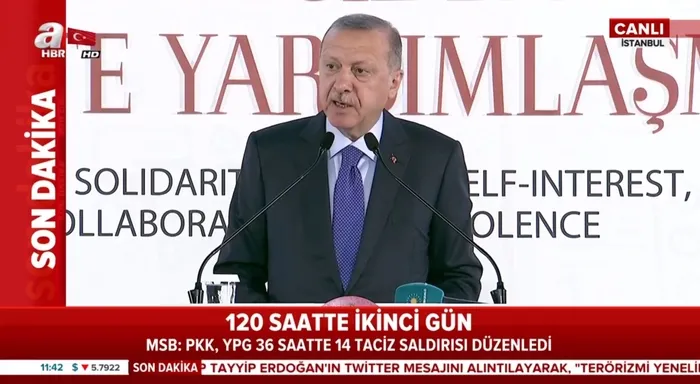 Başkan Recep Tayyip Erdoğan, İstanbul'da düzenlenen 3. Afrika Ülkeleri Dini Liderler Zirvesi'nde konuşuyor. Erdoğan, "1992 yılındaki Ruanda Soykırımı'nda hangi sömürgeci devletin parmağı olduğunu siz daha iyi biliyorsunuz. Bugün bize silah ambargosu uygulayanlar o günlerde eli kanlı katillere silah verdi" diyerek Batı'lı ülkelerin Barış Pınarı harekatı sürecinde Türkiye'ye yönelik silah ambargosuna tepki gösterdi