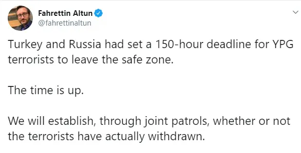 Fahrettin Altun, "Rusya Federasyonu ile sağlanan mutabakat kapsamında terör örgütü PKK/YPG'ye güvenli bölgeden çekilmesi için verilen 150 saatlik süre dolmuştur. Çekilmenin gerçekleşip gerçekleşmediğini ortak devriyeler kapsamında netleştireceğiz.." ifadelerini kullandı.