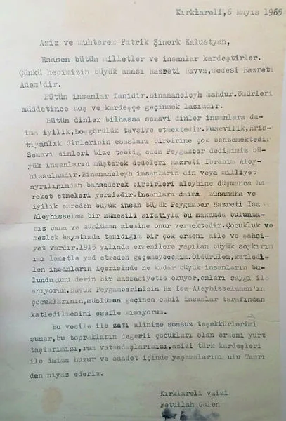 Diğer 32 zanlıda sorgularının ardından bugün adliyeye sevk edildi. Zanlılardan Adana'da yakalanan N.G.'nin cep telefonunda yapılan incelemede ise terörist başı Fetullah Gülen'in 1965 yılında Kırıklareli'de bir camide vaiz olarak görev yaparken Ermeni asıllı Papaz Patrik Şinork Kalustyan'a yazdığı mektup ortaya çıktı. Gülen'in kaleme aldığı ve ıslak imzasının bulunduğu mektupta, "sözde Ermeni soykırımını" tanıyarak şunları yazdığı görüldü: