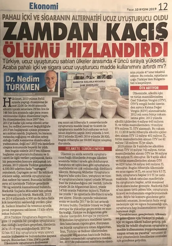 Bilindiği üzere dünya genelinde 31 milyon uyuşturucu bağımlısı var. Yapılan araştırmalara göre dünya genelinde uyuşturucu madde kullanımında artış bulunuyor. Bunun için gerekli önlemler de Emniyet mensuplarınca alınıyor. Dr. Nedim Türkmen köşe yazısında, "Böyle bir konuyu gündeme getirmekteki amacım, insanların fazla vergi nedeniyle içki ve sigara bulamadığı için, uyuşturucu hap kullanmalarını meşrulaştırmak değil" diye bir cümle kullandı. Ancak Türkiye sigara fiyat düzeyi Avrupa Birliği'ndeki sigara fiyatlarına göre en ucuz ikinci ülke. Sigaraya para bulamadılar, uyuşturucuya yöneldiler söylemi bu açıdan zorlayıcı bir kara propaganda yöntemi.