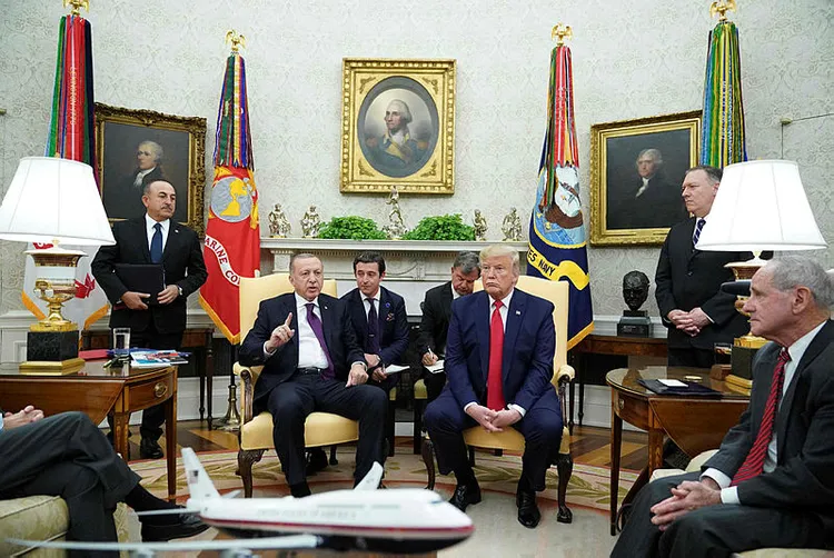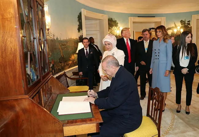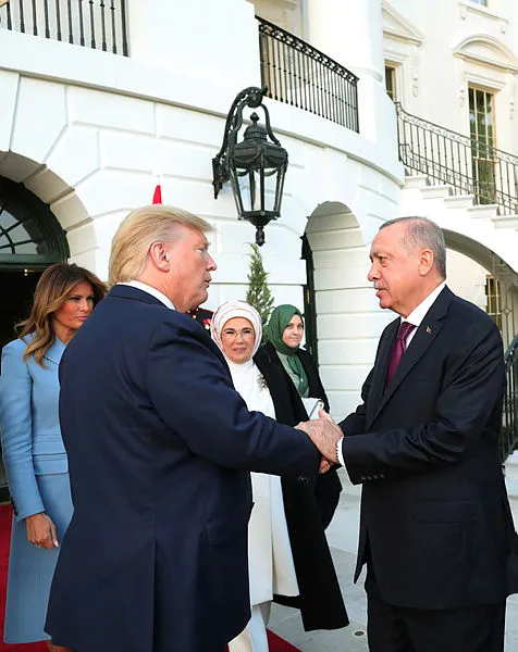 Başkan Erdoğan, ABD Başkanı Donald Trump tarafından resmi törenle karşılandı. Daha sonra Şeref Defteri'ni imzalayan Erdoğan, baş başa görüşme için Oval Ofis'e geçti. "Erdoğan'ı ağırlamak büyük bir onur" diyen Trump, ikili görüşme öncesinde Oval Ofis'te gazetecilere açıklamalarda bulundu. Erdoğan ile uzun süredir dost olduklarını vurgulayan Trump, Türkiye- Suriye sınırında yaptığı işlerden dolayı Erdoğan'a teşekkür ettiğini söyledi. Trump, bölgedeki tarihi anladığını da belirterek, "Onların (Türkiye ile YPG-PKK) sorunlarını anlıyorum. Türkiye'den de birçok insan hayatını kaybetti. Bunun hakkında da bir şeyler yapmak zorundayız. Bu tek yön bir yol değil. Ateşkes sürüyor, Kürtlerle (YPG/PKK) görüştük, gayet memnunlar" diye konuştu. Türkiye ile ABD'nin ticaret hacmini genişletmeye çalıştıklarını da vurgulayan Trump "Kolaylıkla 100 milyar dolar olabilir" dedi.