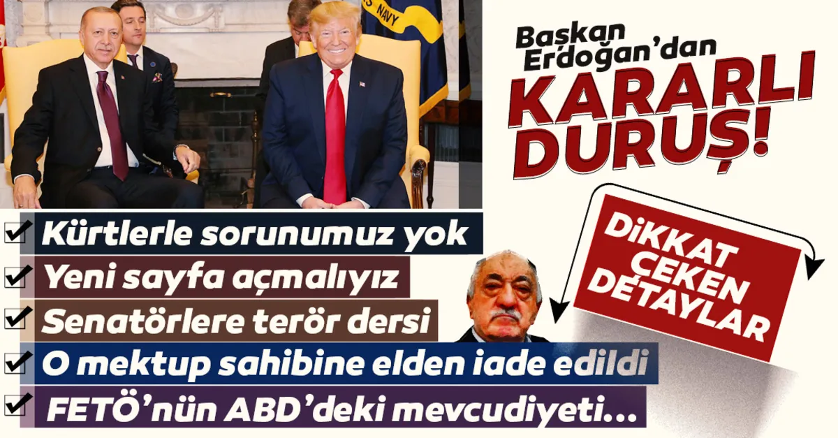 Başkan Erdoğan, Oval Ofis'te senatörlerle yaptığı toplantı sırasında adeta ders verdi. Erdoğan, Trump'a dönerek, "Sizin Kürt diye zikrettiğiniz, PYD/YPG. Bunlar terör örgütü, bunlar PKK'nın yan kuruluşlarıdır" dedi. Senatörlere, "Ferhat Abdi Şahin (Mazlum Kobani), Apo denilen bölücü terör örgütü başının aslında manevi evladıdır" bilgisini veren Erdoğan, "Güvenli Bölge'ye 1 milyon, Rakka ve Deyrizor bölgesine de 1 milyon mülteci yerleştirebiliriz" diye konuştu. Trump da Türkiye'nin 4 milyon mülteciye ev sahipliği yaptığını, Avrupa'nın artık sorumluluk alması gerektiğini söyledi.