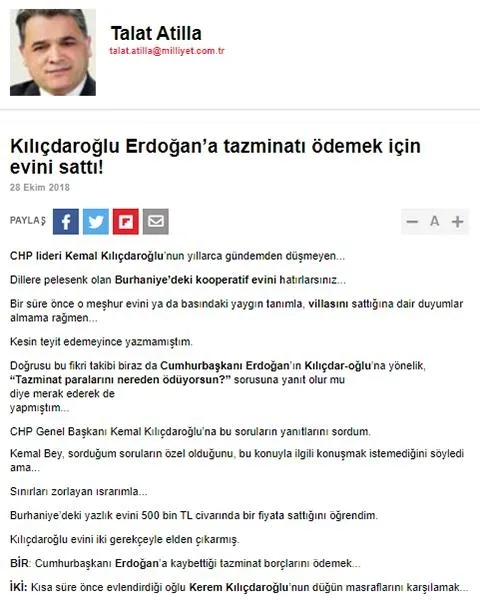 Talat Atilla'nın 28 Ekim 2018 tarihli Milliyet gazetesindeki köşe yazısında yazdığı Burhaniye'deki yazlık haberi Kılıçdaroğlu'nun iddialarını çürütüyor.