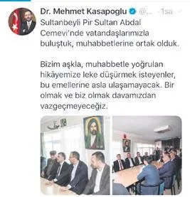 Gençlik ve Spor Bakanı Dr. Mehmet Muharrem Kasapoğlu dün İstanbul Sultanbeyli'de Pir Sultan Abdal Cemevi'ni ziyaret etti. Kasapoğlu'nu, vatandaşlar ve Alevi dedeleri karşıladı. Cemevinde vatandaşlarla bir araya gelen Kasapoğlu Sultanbeyli'de açılışını yaptığı Aşık Veysel Parkı ile ilgili sorulara da yanıt verdi. Kasapoğlu, parkta spor yapılabilmesi için, gereken tüm eksiklerin tamamlanacağını belirtti. Bakan Kasapoğlu cemevi ziyaretinin ardından sosyal medyada ise şu tweeti paylaştı: "Bizim aşkla, muhabbetle yoğrulan hikâyemize leke düşürmek isteyenler bu emellerine asla ulaşamayacak. Bir olmak ve biz olmak davamızdan vazgeçmeyeceğiz."