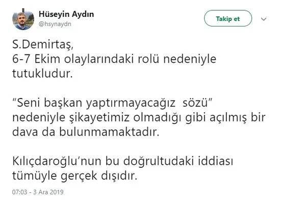 Sosyal medya hesabından açıklama yapan Av. Aydın, " Selahattin Demirtaş, 6-7 Ekim olaylarındaki rolü nedeniyle tutukludur. "Seni başkan yaptırmayacağız sözü" nedeniyle şikayetimiz olmadığı gibi açılmış bir dava da bulunmamaktadır. Kılıçdaroğlu'nun bu doğrultudaki iddiası tümüyle gerçek dışıdır." dedi.