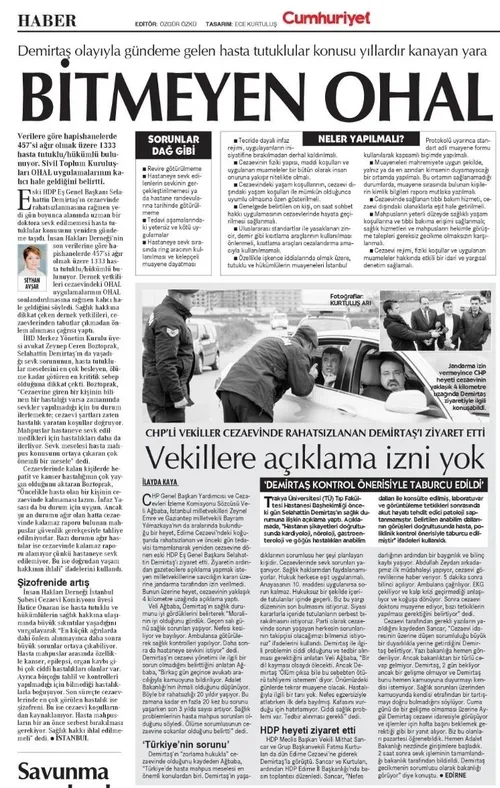 Hapishanelerde 457'si ağır olmak üzere 1333 hasta tutuklu/hükümlü bulunduğu iddiasını haberleştiren Cumhuriyet, dernek yetkililerinin cezaevindeki OHAL uygulamalarının OHAL sonlandırılmasına rağmen kalıcı hale geldiğini iddia ettiği açıklamasına da yer verdi. Gazete, bu şekilde Türkiye'deki cezaevlerini karalamaya da çalıştı.