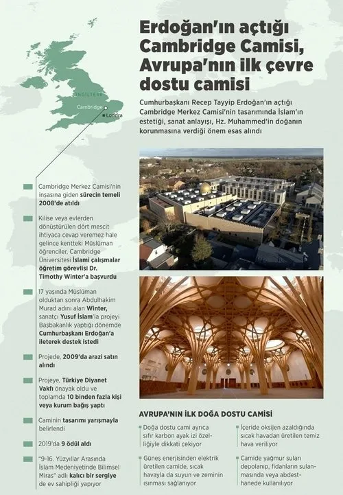 Diyanet teşkilatımızla birlikte projeye öncülük eden herkesi ayrıca tebrik ediyorum. Cambridge Cami 5272 metrekare, bin 300 kişilik kapasiteye sahip. Çevre hassasiyeti, güneş panelleri ile Avrupa'nın ilk çevre dostu camisidir. Bu külliyede sergi salonu sosyal donatı da bulunuyor. Cambridge Cami külliyesi misafirperverliğimizi bu topraklarda yaşatacak.