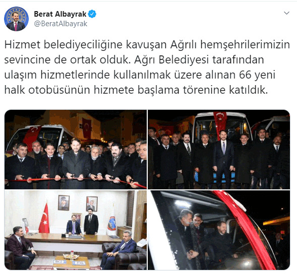 Bakan Albayrak sosyal medya hesabından yaptığı paylaşımda "Hizmet belediyeciliğine kavuşan Ağrılı hemşehrilerimizin sevincine de ortak olduk. Ağrı Belediyesi tarafından ulaşım hizmetlerinde kullanılmak üzere alınan 66 yeni halk otobüsünün hizmete başlama törenine katıldık." ifadelerini kullandı.