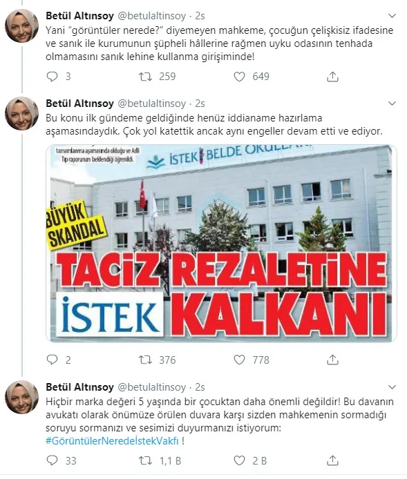 "Ben Betül Altınsoy. İstek Vakfı'na ait bir anaokulunda cinsel istismara uğramış 5 yaşında bir çocuğun avukatıyım. Sizden duyurmanızı istediğim bir ricam var.. Kızımız 2017 yılında İstek Vakfı Anaokulu'na gitmekteydi. Süreç, yüzme derslerinin olduğu günlerde küçük kızın okula gitmek istememesi ve tepki vermesiyle başladı.Aile durum karşısında şüphelenmeye başladığında kızına neden okula gitmek istemediğini sormaya başladı. Bunun üzerine küçük kızımız detaylar vermeye başladı. İyice şüphelenen ailenin kızlarına "okul yıkıldı artık gitmeyeceksin" demeleri üzerine ise kız yaşadığı her şeyi anlatıyor. Burada paylaşmak istemediğim korkunç ifadeler!