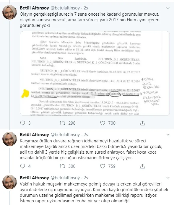 Olayın gerçekleştiği sürecin 7 sene öncesine kadarki görüntüler mevcut, olaydan sonrası mevcut, ama tam süreci, yani 2017'nin Ekim ayını içeren görüntüler yok! Karşımıza örülen duvara rağmen iddianameyi hazırlattık ve süreci mahkemeye taşıdık ancak üzerimizdeki baskı bitmedi.5 yaşında bir çocuk, adli tıp dahil 3 yerde hiç çelişkisiz tüm süreci anlatıyor, fakat koca koca insanlar küçücük bir çocuğun istismarını örtmeye çalışıyor. Vakfın hukuk müşaviri mahkemeye gelmiş davayı izlerken okul görevlileri aynı ifadelerle üç maymunu oynuyor. Kamera kaydı görüntülerindeki şüpheli durumun üzerine gidilmesi gerekirken mahkeme bilirkişi raporu istiyor. İstenen rapor uyku odasının tenha bir yer olup olmadığı! Yani "görüntüler nerede?" diyemeyen mahkeme, çocuğun çelişkisiz ifadesine ve sanık ile kurumunun şüpheli hâllerine rağmen uyku odasının tenhada olmamasını sanık lehine kullanma girişiminde!"