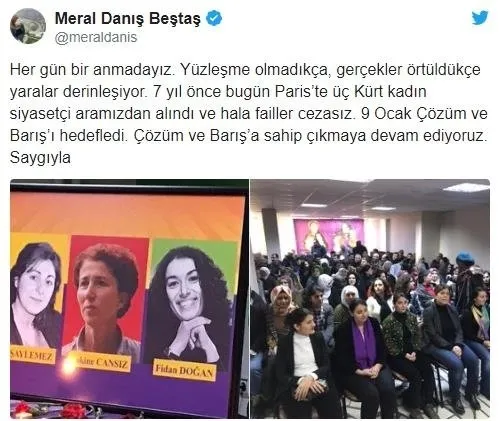 HDP'li Vekil Meral Danış Beştaş, paylaşımında şu ifadeleri kullandı: Her gün bir anmadayız. Yüzleşme olmadıkça, gerçekler örtüldükçe yaralar derinleşiyor. 7 yıl önce bugün Paris'te üç Kürt kadın siyasetçi aramızdan alındı ve hala failler cezasız. 9 Ocak Çözüm ve Barış'ı hedefledi. Çözüm ve Barış'a sahip çıkmaya devam ediyoruz. Saygıyla