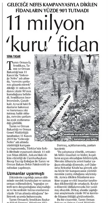 Cumhuriyet Gazetesi muhabiri Sena Yaşar imzalı "Milyonlarca fidan tutmadı" başlıklı "haber" bugün Cumhuriyet gazetesinin birinci sayfasından anons edildi..