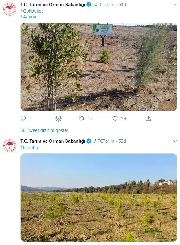Başkan Recep Tayyip Erdoğan'ın katılımıyla 11 Kasım'da dikilen 11 milyon fidanın yüzde 90'ının kuruduğu iddiasına Tarım ve Orman Bakanlığı'ndan açıklama geldi. Bakanlık, bugün Cumhuriyet Gazetesi'nde çıkan "10 milyon fidan kurudu" başlıklı haberle ilgili yaptığı açıklamada ayrıca İstanbul ve Adana'da ekilen fidanların son halini gösteren fotoğraflara da yer verildi.