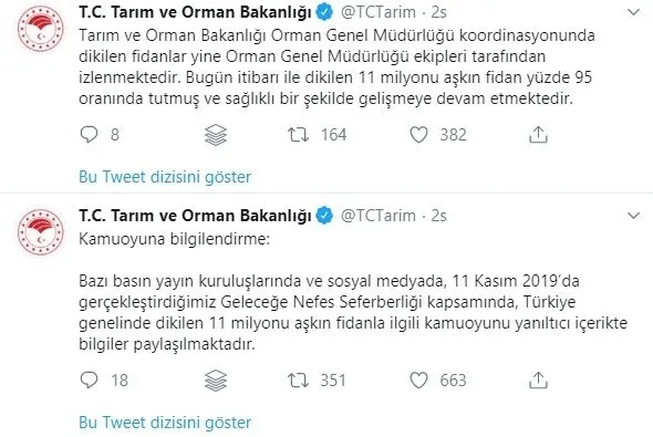 Bakanlığın Twitter hesabından yapılan açıklamada, "Bazı basın yayın kuruluşlarında ve sosyal medyada, 11 Kasım 2019'da gerçekleştirdiğimiz 'Geleceğe Nefes Seferberliği' kapsamında, Türkiye genelinde dikilen 11 milyonu aşkın fidanla ilgili kamuoyunu yanıltıcı içerikte bilgiler paylaşılmaktadır. Tarım ve Orman Bakanlığı Orman Genel Müdürlüğü koordinasyonunda dikilen fidanlar yine Orman Genel Müdürlüğü ekipleri tarafından izlenmektedir. Bugün itibarı ile dikilen 11 milyonu aşkın fidan yüzde 95 oranında tutmuş ve sağlıklı bir şekilde gelişmeye devam etmektedir" denildi.
