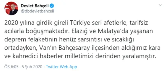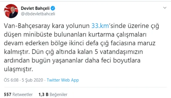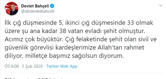 Bahçeli: İlk çığ düşmesinde 5, ikinci çığ düşmesinde 33 olmak üzere şu ana kadar 38 vatan evladı şehit olmuştur. Acımız çok büyüktür. Çığ felaketinde şehit olan sivil ve güvenlik görevlisi kardeşlerimize Allah'tan rahmet diliyor, milletçe başımız sağolsun diyorum.