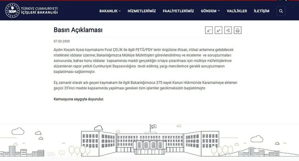 "Aydın'ın Koçarlı Kaymakamı Fırat Çelik ile ilgili FETÖ/PDY terör örgütüne iltisak, irtibat anlamına gelebilecek nitelikteki iddialar üzerine; Bakanlığımızca mülkiye müfettişleri görevlendirilmiş, inceleme ve soruşturmaları sonucunda bahse konu iddialar kapsamında maddi gerçekliğin ortaya çıkarılması için mülkiye müfettişlerince düzenlenen rapor, yetkili Cumhuriyet Başsavcılığı'na tevdi edilmiş, yargı mercilerince gerekli soruşturmanın başlatılması sağlanmıştır. Eş zamanlı olarak adı geçen kaymakamla ilgili Bakanlığımızca 375 sayılı Kanun Hükmünde Kararnameye eklenen geçici 35'inci madde kapsamında yapılması gereken tüm işlemler, gecikmeksizin başlatılmıştır. Kamuoyuna saygıyla duyurulur"