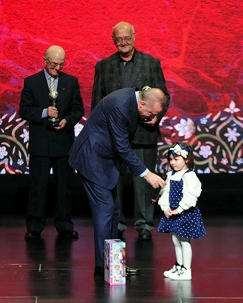 Konuşmasının ardından Yaşayan İnsan Hazineleri almaya hak kazanan kişilere ödüllerini takdim eden Erdoğan, çini sanatında ödüle layık görülen Hamza Üstünkaya'ya sahneye çıkarken eşlik eden çocukla sohbet etti.