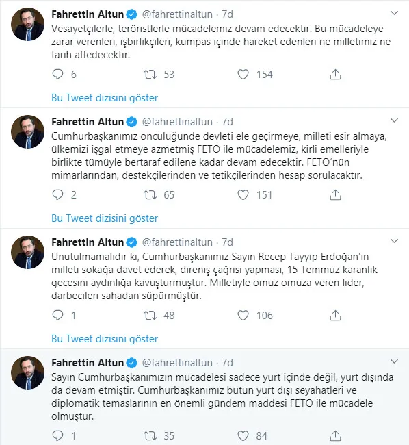 "FETÖ'ye yönelik topyekun başlatılan arındırma operasyonlarının talimatını bizzat Sayın Cumhurbaşkanımız Recep Tayyip Erdoğan vermiştir." ifadesini kullanan Altun, "Erdoğan'ın direnmeyip, vesayete teslim olması halinde demokratik yönetimi rafa kaldırmayı hedefleyen ve sinsi emellerini 50 yıllık süreç içerisinde adım adım uygulayan FETÖ'nün Türkiye'yi topyekun işgal edeceğini" kaydetti.