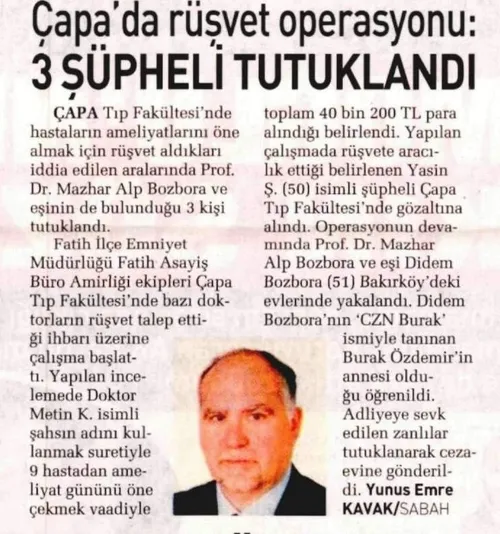 Son dakika haberi! İstanbul Çapa Tıp Fakültesi'ndeki rüşvet operasyonundan detaylar ortaya çıktı. İstanbul Tıp Fakültesi Hastanesi'nde 9 hastadan ameliyat tarihinin öne çekilmesi için 40 bin 200 lira aldıkları iddiasıyla yapılan operasyonda tutuklanan Prof. Dr. Mazhar Alp Bozbura ve CZN Burak'ın annesi Didem Bozbura'nın da aralarında bulunduğu 3 şüphelinin emniyette verdikleri ifadeler ortaya çıktı. Kendisinden rüşvet almak istendiğini savunan hastanın oğlu ise yaşanan süreçle ilgili iddialarını anlattı.