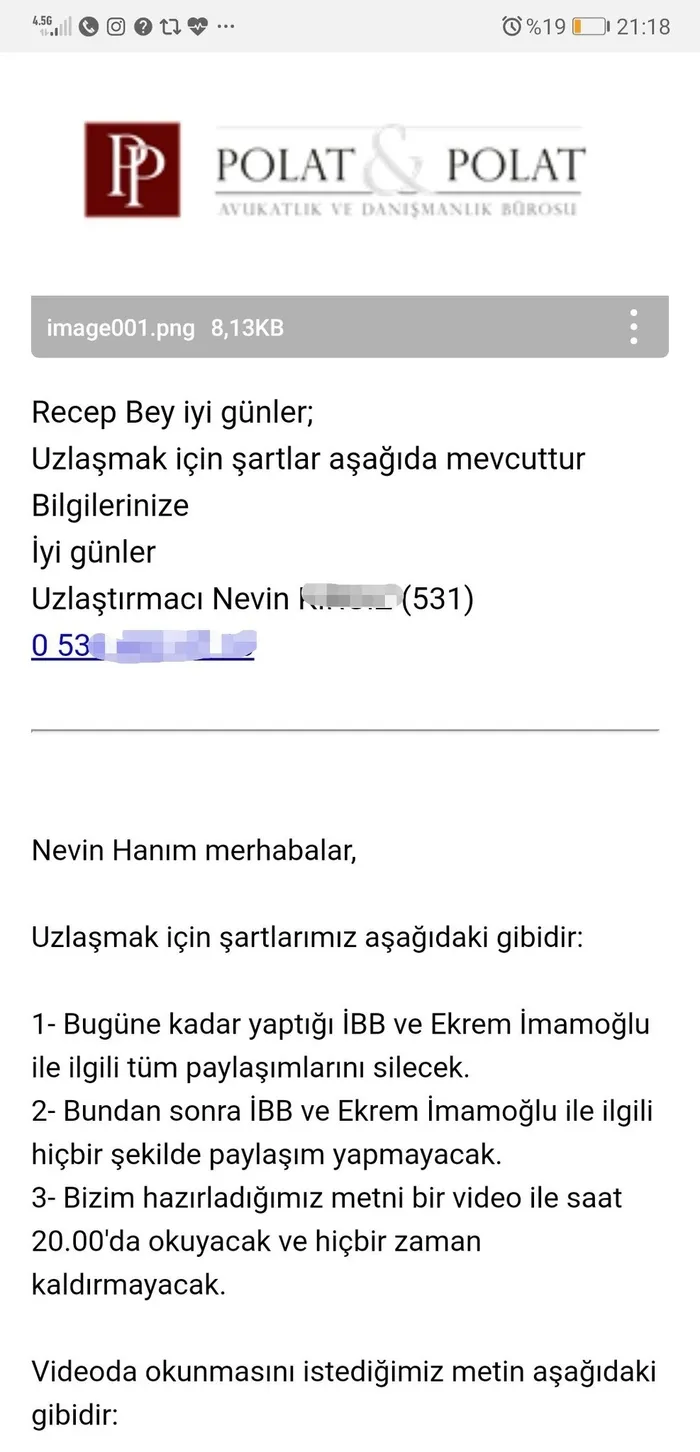 Skandallar silsilesi ise burada son bulmazken İmamoğlu'nun talimatıyla gönderilen mesajda "Bu metni okurken çekilen videoyu öncelikle bize göndermesini (İnfo@polat-polat.com) talep ediyoruz. Bizden onay alması durumunda sosyal medya hesaplarından bu videoyu yayınlaması gerekmektedir. Şartlara aykırı davranırsa her bir tweeti için ayrı ayrı 50'şer bin liralık tazminat davaları açacağız. Bunun da kendisine bildirilmesini rica ediyoruz" diyerek tehdit edildiği görüldü.