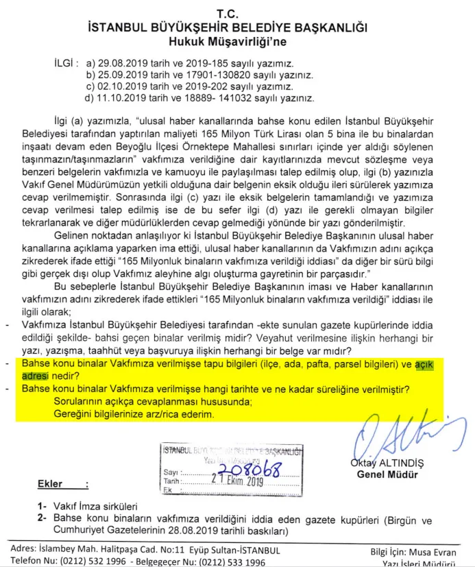 İstanbul Büyükşehir Belediyesi Hukuk Müşavirliği, 25 Eylül 2019 tarihinde, TÜRGEV'in bilgi talebinin Genel Müdür Oktay Altındiş'in yetkili olduğuna dair belgenin eksik olduğunu öne sürdü ve bilgi talebine cevap vermedi.