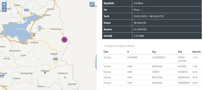 Şoke eden sarsıntı İran'da sabah saat 08.53'te meydana geldi. AFAD 5.22 kilometre derinlikte gerçekleşen depremin büyüklüğünü 5.9 olarak açıkladı. Kandilli Rasathanesi ise depremin büyüklüğünü 5.8, derinliğini 8.4 olarak ilan etti.