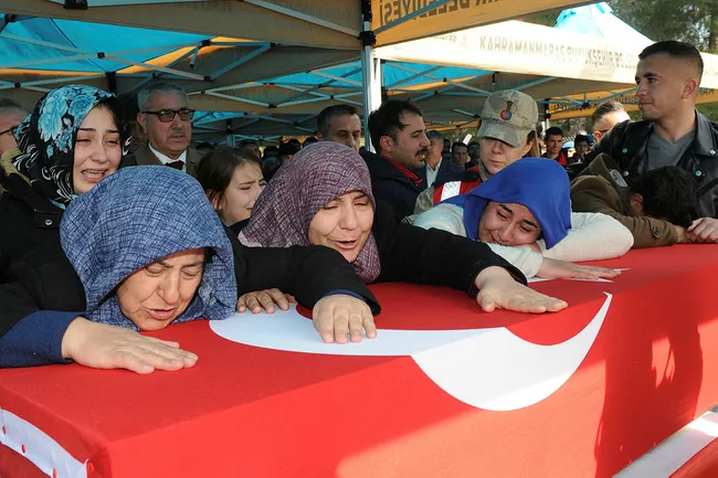 İdlib’de rejimin alçak saldırısı sonucu şehit olan Piyade Uzman Çavuş Soner Enes Baykuş'un cenazesi, memleketi Kahramanmaraş'a getirildi. Oğlunu havaalanında asker selamıyla karşılayan anne Zeynep Baykuş, "Kimseye meydan vermeyeceğiz, bir ölür bin doğarız kuzum" dedi.