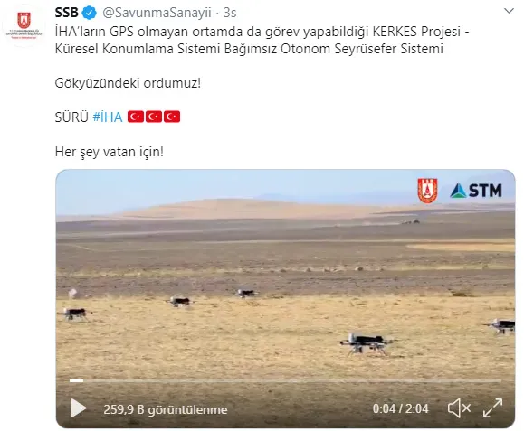 Cumhurbaşkanlığı Savunma Sanayii Başkanlığına ait sosyal medya hesabı üzerinden "İHA'ların GPS olmayan ortamda da görev yapabildiği KERKES Projesi-Küresel Konumlama Sistemi Bağımsız Otonom Seyrüsefer Sistemi, gökyüzündeki ordumuz. SÜRÜ #İHA Her şey vatan için" notuyla paylaşılan görüntülerde, sürü İHA'ların yakında göreve hazır olacağı belirtildi.