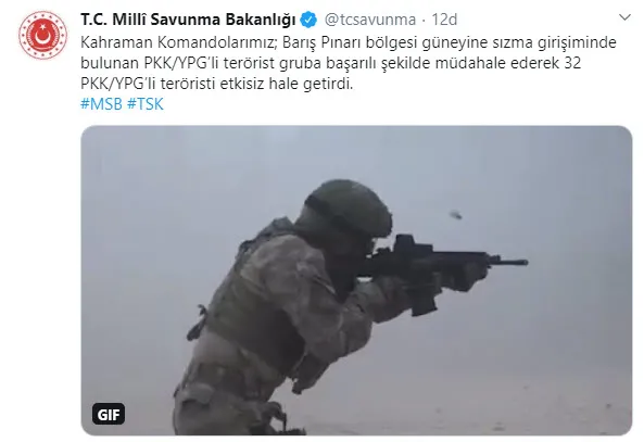 Son dakika gelen bilgilere göre Milli Savunma Bakanlığı, Barış Pınarı Bölgesinde düzenlenen operasyonda 32 PKK'lının öldürüldüğünü açıkladı.