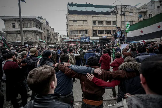 Bombardıman korkusu yaşamadan sokaklara çıkan İdlibliler, kent meydanında toplanarak sevinç gösterisinde bulundu.