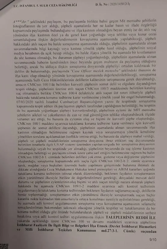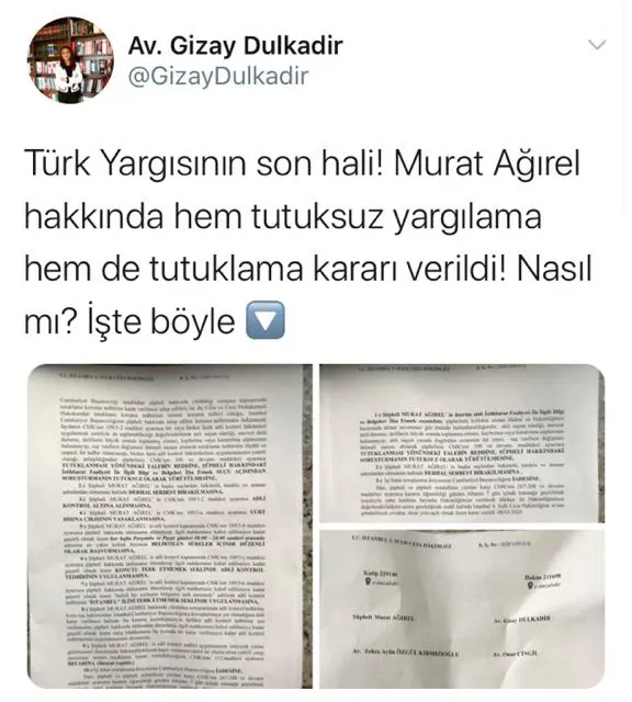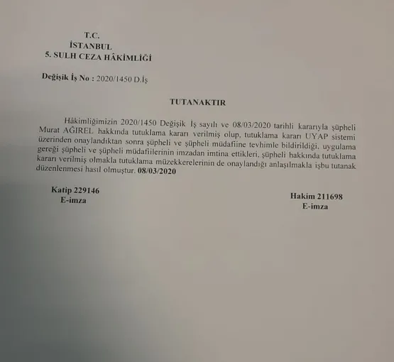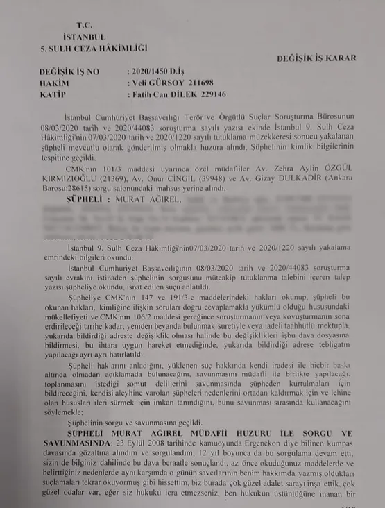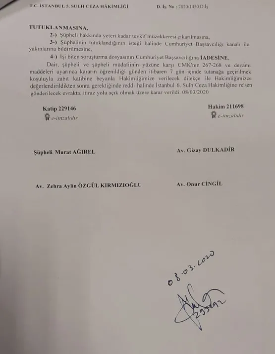 - İstanbul 5. Sulh Ceza Mahkemesi'nin Murat Ağırel hakkında tutuklamaya yönelik karar metni 10 sayfadan oluşuyor. Mahkemenin 10 sayfalık kararında; Murat Ağırel'in serbest bırakılmasına yönelik hiçbir kelime yer almıyor.
