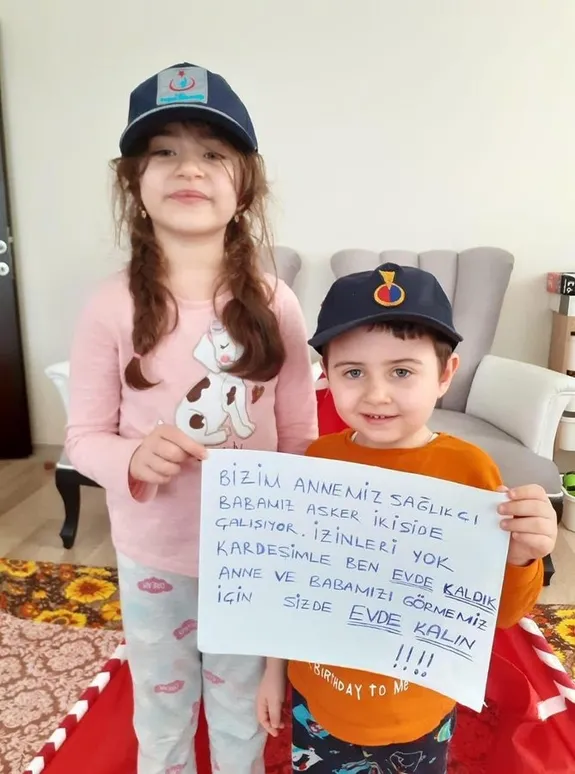 Sağlık Bakanı Fahrettin Koca, Samsun'da yaşayan, annesi sağlık personeli, babası ise asker kardeşlerin "Anne ve babamızı görmemiz için siz de evde kalın." mesajını paylaştı.