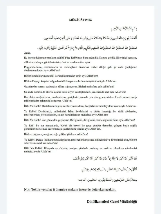 "Ey bu okuduğumuz ezanların sahibi Yüce Rabbimiz. Sana sığındık. Kapına geldik. Ellerimizi semaya, dillerimizi duaya, gönüllerimizi şefkat ve merhametine açtık. Peygamberlerin, mazlumların ve muhtaçların dualarına icabet ettiğin gibi şu anda yaptığımız dualarımızı kabul eyle Allah'ım! Bizleri umduklarımıza nâil, korktuklarımızdan emin eyle Allah'ım! Bütün dünyayı kuşatan salgın hastalık karşısında bizlere inâyetini lutfeyle Allah'ım. Gazabından rızana, azabından affına sığınıyoruz. Bizleri muhafaza eyle Allah'ım! Şu anda huzurunda ellerini açarak âmin diyen kardeşlerimizi, iki cihanda aziz eyle Allah'ım! Her daim mağdurların, mazlumların, gariplerin yanında yer almış; çaresizlere kucak açmış necip milletimizden rahmetini esirgeme Allah'ım! İlâhi Ya Rabbi! Hastalarımıza şifa, dertlilerimize deva, borçlularımıza kolaylıklar nasib eyle Allah'ım! Ya Rabbi! Devletimizi, milletimizi, İslam beldelerini ve bütün insanlığı her türlü afetlerden, musibetlerden, kötülüklerden, salgın hastalıklardan muhafaza eyle Allah'ım! İlâhi Ya Rabbi! Zor günlerden geçiyoruz. Birliğimizi, dirliğimizi, kardeşliğimizi daim eyle Allah'ım! Ya Rab! Bu zor zamanlarda, büyük bir özveri ile gece gündüz demeden çalışan başta sağlık görevlilerimiz olmak üzere tüm çalışanlarımıza yardım eyle Allah'ım. Bizlere taşıyamayacağımız ağır yükler yükleme Allah'ım! Ya Rabbi! Dünya imtihanımızı kolaylaştır, musibetler karşısında bilincimizi ve direncimizi artır, bizlere sabır ve metanet ver Allah'ım! İlâhi Ya Rabbi! Dünyada ve ahirette, mahşer gününde mahcup ve mahzun olmaktan cümlemizi muhafaza eyle Allah'ım!"