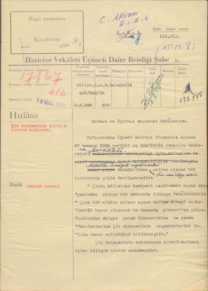 Son dakika haber: Kıran, "Kolera salgını nedeniyle, 1938 yılında Çin'e göndermeyi taahhüt ettiğimiz aşılara ilişkin diplomatik arşivimizden belgeler..." notuyla paylaştığı mesajda, bazı diplomatik arşiv belgelerine yer verdi.