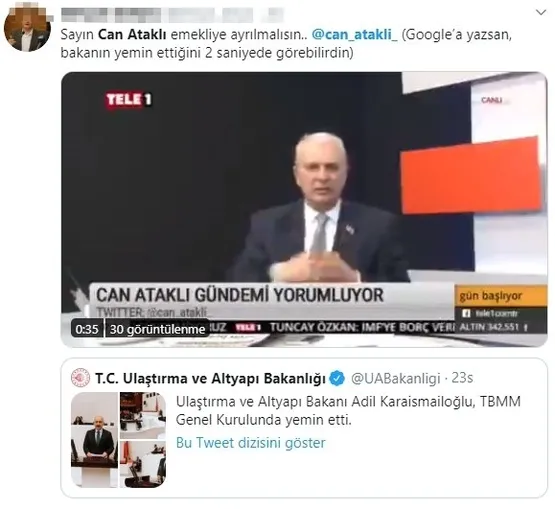 Can Ataklı'nın skandallarının arkası kesilmiyor. Geçtiğimiz günlerde öğrencilere uzaktan eğitimde ders veren başörtülü öğretmenlere nefret saçan Ataklı, şimdi de yeni Ulaştırma ve Altyapı Bakanı Adil Karaismailoğlu'nu hedef aldı. Karaismailoğlu'nun Meclis'te görevine yemin etmeden başladığını iddia eden Ataklı'nın bu sözlerinin gerçeği yansıtmadığı kısa sürede ortaya çıktı. Bu asılsız sözleriyle hükümete yaptığı manipülasyonlar açıkça ortaya çıkan Ataklı'ya sosyal medyadan da tepkiler gecikmedi.