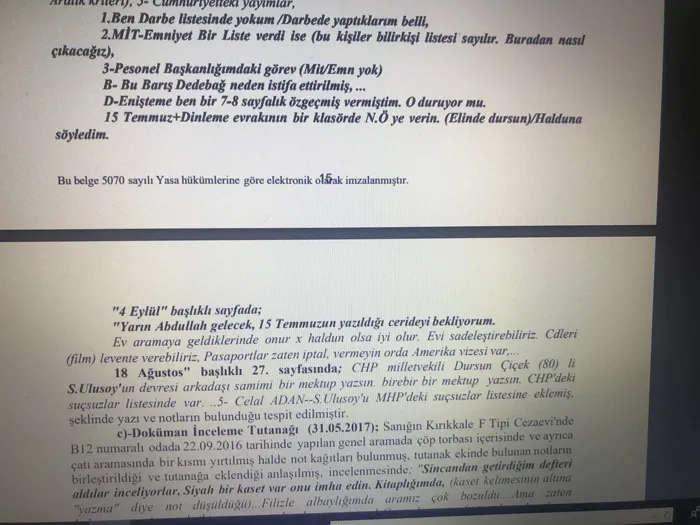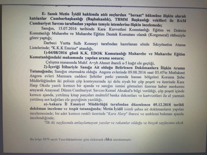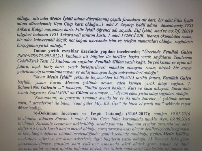 Ankara İl Emniyet Müdürlüğü tarafından düzenlenen 5 Aralık 2018 tarihli doküman inceleme ve tespit tutanağında; Metin İyidil isimli şahsa ait dokümanların yapılan incelemesine yer verildi.