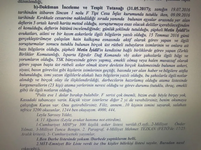 Tutanakta; defterin bütünü incelendiğinde; günlük şeklinde tutulduğu, şüpheli Metin İyidil'in avukatları, ailesi ve bir kısım askerlerle ilgili bilgilerin yazılı olduğu ifade edildi.
