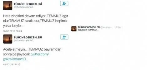 Bilindiği gibi şüpheli Mesut Aykın'ın 15 Temmuz'dan bir ay kadar önce "Acele etmeyin… Temmuz bayramdan sonra başlayacak" dediği, yine darbe girişiminden bir ay önce 15 Haziran 2016 tarihinde, "Temmuz, Temmuz…" şeklinde tweet atarak darbeyi çağrıştırdığı belirlenmişti. Darbe girişiminden tam 1 ay önce 16 Haziran 2016 günü ise "Hata zincirleri devam ediyor… Temmuz ağır olur, Temmuz sıcak olur, Temmuz hepimizi yakar beyler.." dediği anlaşılmıştı. Ayrıca Aykın 25 Haziran 2016 tarihinde "Bir oğlum olacak adı Temmuz. Öfkede benden fırtına, sevgide deniz ne samanyollarının ulu kervanları susuzluğumun" ve aynı gün "Ne kutup şafaklarında tanrılaşması ilkelliğimin Temmuz gibi sıcak ve bereketli Temmuz gibi uçsuz bucaksız" tweetlerini atmıştı. Aykın 2016 yılında gözaltına alınmış fakat daha sonra serbest kalmıştı.